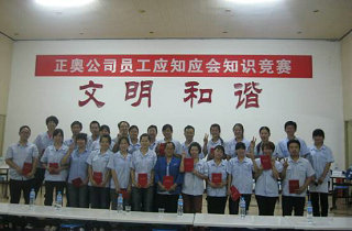 .為了促進公司全體一線員工學習、掌握崗位應知應會知識和基本的崗位技能、行為規(guī)范,提升一線員工的綜合技能素質,正奧公司工會組織生產一線員工,在發(fā)放知識卡片、進行全員書面測試的基礎上,選拔優(yōu)秀選手于9月14日晚開展了“應知應會知識競賽”活動,本次競賽根據生產工序共選撥7支參賽隊,每隊由3人組成。通過必答、搶答、觀眾互動等形式,根據各隊答題得分情況最終產生一、二、三等獎,公司領導為獲獎選手們頒發(fā)榮譽證書和獎金。